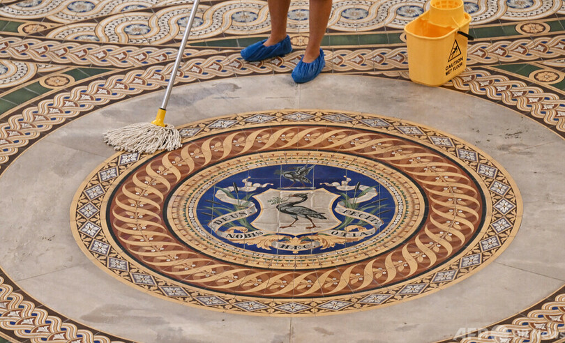 【8月13日 AFP】英北西部リバプールにある聖ジョージ・ホール(St George's Hall)のミントンタイル(Minton Tile)の床を掃除する市職員。