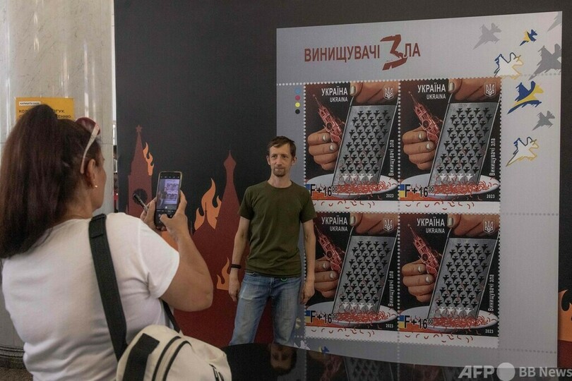 ウクライナではこれまで、前線の兵士や英覆面ストリートアーティスト、バンクシー(Banksy)の作品、ロシアの軍艦に向かってウクライナ兵が中指を立てている切手が発行され、大きな人気を集めている。(c)AFP