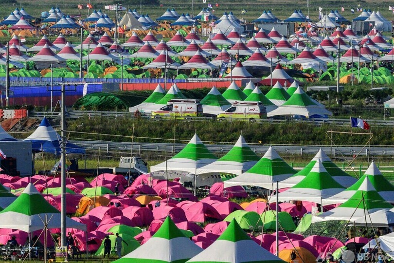 全羅北道(North Jeolla Province)扶安(Buan)郡のキャンプ地では8日、スカウトたちがテントを片付け荷物をまとめ、ソウルと周辺地域の代替宿泊施設に向かうバスに乗るため列をつくっていた。