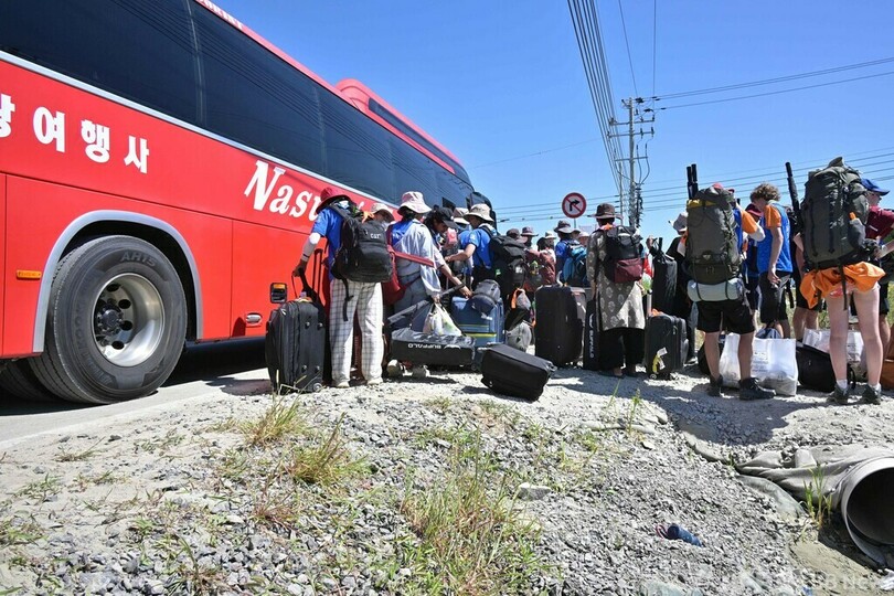 全羅北道(North Jeolla Province)扶安(Buan)郡のキャンプ地では8日、スカウトたちがテントを片付け荷物をまとめ、ソウルと周辺地域の代替宿泊施設に向かうバスに乗るため列をつくっていた。