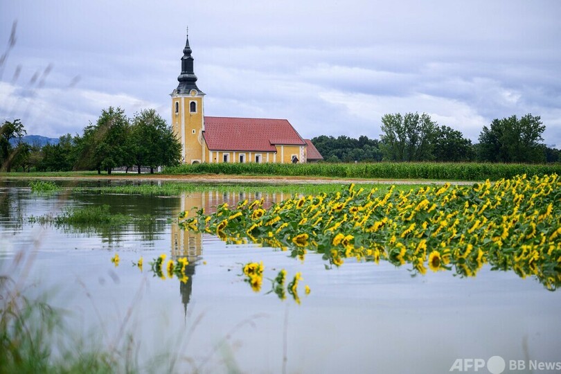 【8月16日 AFP】豪雨による川の氾濫で一面が水浸しとなったひまわり畑。スロベニア南東部ドラマ(Drama)で。スロベニア独立以降で最悪の自然災害となった今回の豪雨では鉄砲水や地滑りが各地で発生し、同国の中央部と北部の大部分が水没した。(c)AFP