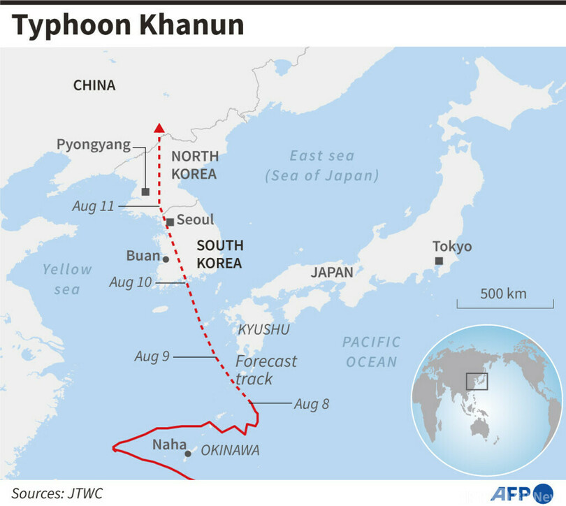 (AFP) Flights were cancelled, bullet trains partially suspended and factories shuttered on Tuesday as Typhoon Khanun headed past Japan's southernmost main island of Kyushu, bringing heavy rain.