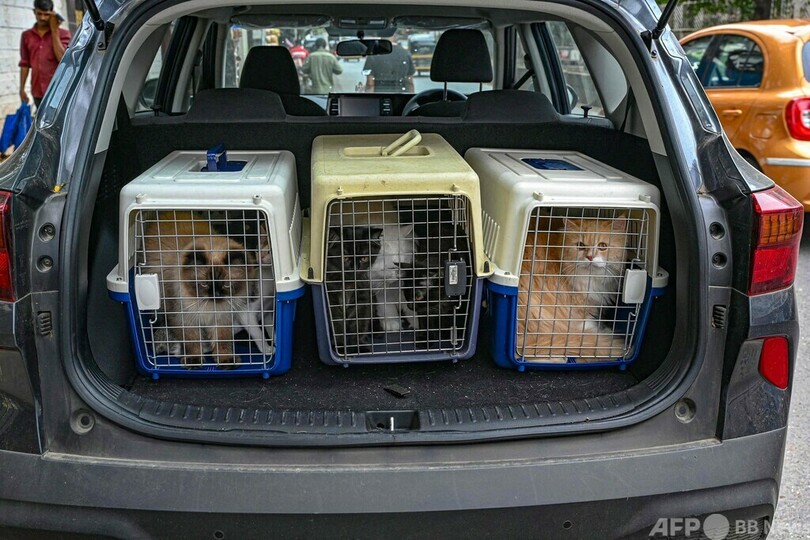 インド西部マハラシュトラ(Maharashtra)州ムンバイ(旧ボンベイ)にある猫カフェ「キットキャット・カフェ(Kit Cat Cafe)」では、いつもと変わらず利用者やスタッフらによってなでられたり、グルーミングされたりしてくつろぐネコたちの様子が見られた。(c)AFP