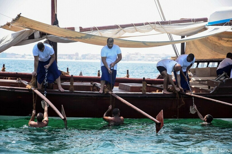 15日には若者たちがダウ船に乗って沖合まで行き、真珠貝を探す様子が見られた。(c)AFP