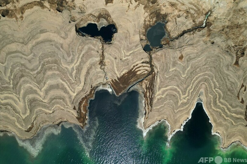 【8月19日 AFP】イスラエル南部のリゾート、ネベゾハール(Neve Zohar)近郊の航空写真。塩湖である死海(Dead Sea)の水が蒸発して結晶化した鉱物とシンクホールと呼ばれる陥没穴でつくられた模様が浮かび上がっている。
