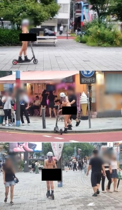 公開された写真は、ビキニだけを着けた女性がキックボードに乗って弘大の通りを行く姿を捉えていた。周囲の市民らは目を見張ったり、携帯電話で撮影したりしていた。