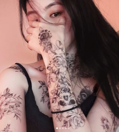 写真によると、タトゥーは大胆に描かれた花やドクロの図柄だ。