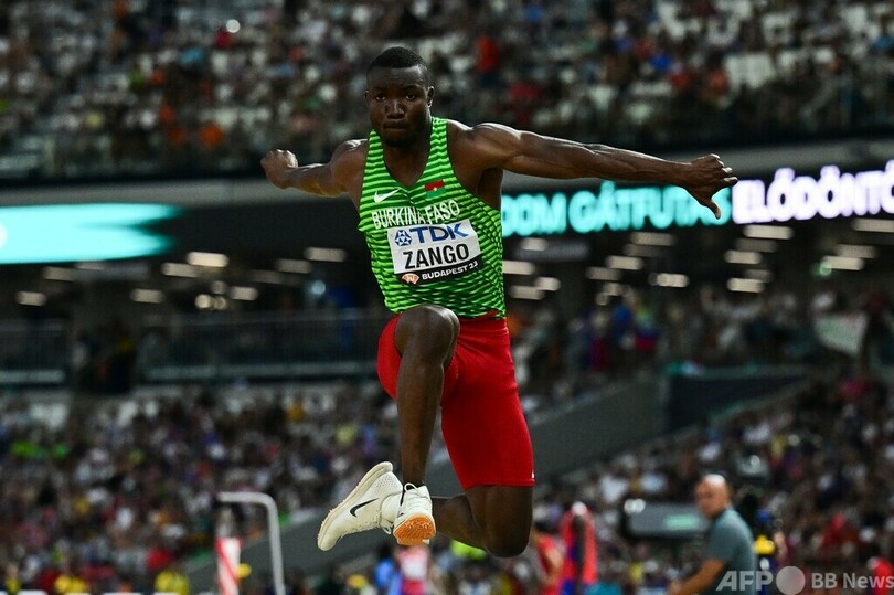 男子三段跳びはユーグ・ファブリス・ザンゴ(Hugues Fabrice Zango)が17メートル64で制し、ブルキナファソ勢として初の世界陸上金メダルに輝いた。(c)AFP/Luke PHILLIPS