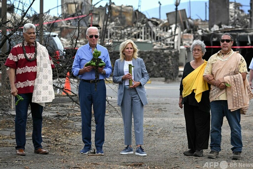 【8月22日 AFP】ジョー・バイデン(Joe Biden)米大統領は21日、妻のジル(Jill Biden)氏と共にハワイ・マウイ(Maui)島入りし、少なくとも114人の犠牲者を出した山火事の被災地を視察した。