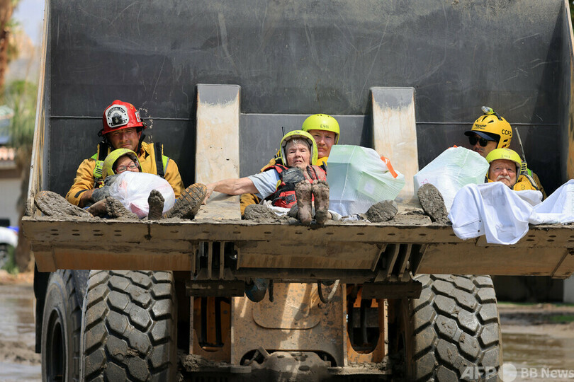 【9月1日 AFP】熱帯低気圧「ヒラリー(Hilary)」により豪雨に見舞われた米カリフォルニア州カテドラルシティ(Cathedral City)で、ブルドーザーを使って住民を救助する消防隊員。