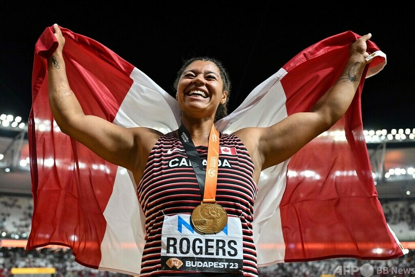 女子ハンマー投げでは、カムリン・ロジャーズ(Camryn Rogers)が77メートル22の投てきで優勝を飾り、男子のこの種目を制したイーサン・カツバーグ(Ethan Katzberg)に続いてカナダ勢が2冠を達成した。(c)AFP/Luke PHILLIPS