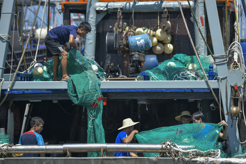 漁業資源保護のため5月から3か月半にわたり設けられた禁漁期間が終わり、多くの漁船が海を「耕す」かのように大海原へ繰り出した。(c)CNS/JCM/AFPBB News