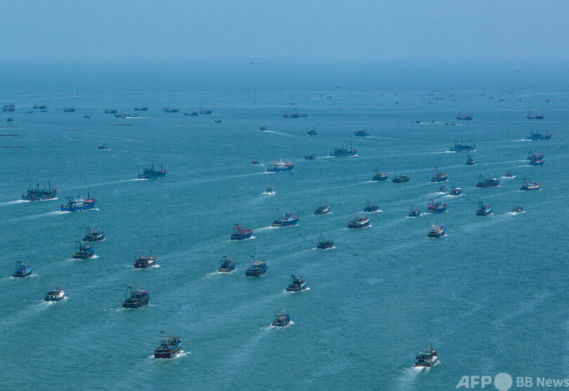 漁業資源保護のため5月から3か月半にわたり設けられた禁漁期間が終わり、多くの漁船が海を「耕す」かのように大海原へ繰り出した。(c)CNS/JCM/AFPBB News