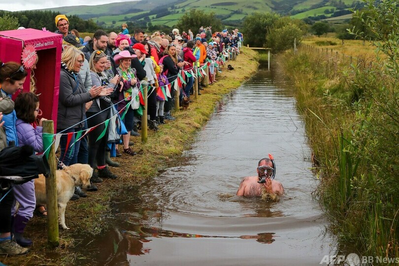 【8月29日 AFP】英ウェールズのスランウルティドウェルズ(Llanwrtyd Wells)にある沼地で27日、毎年恒例の「世界泥沼シュノーケリング選手権大会(World Bog Snorkelling Championships)」が開催された。