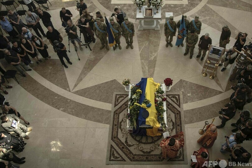 ドニエプル(Dnieper)川のほとりにあるカトリック教会の大聖堂では、親族や兵士を含む弔問者によるウクライナ国歌が響き渡った。国旗で包まれたひつぎの上にはピルシチコウ少佐の帽子が置かれていた。