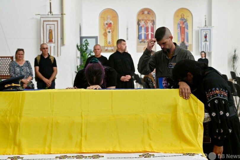 ドニエプル(Dnieper)川のほとりにあるカトリック教会の大聖堂では、親族や兵士を含む弔問者によるウクライナ国歌が響き渡った。国旗で包まれたひつぎの上にはピルシチコウ少佐の帽子が置かれていた。