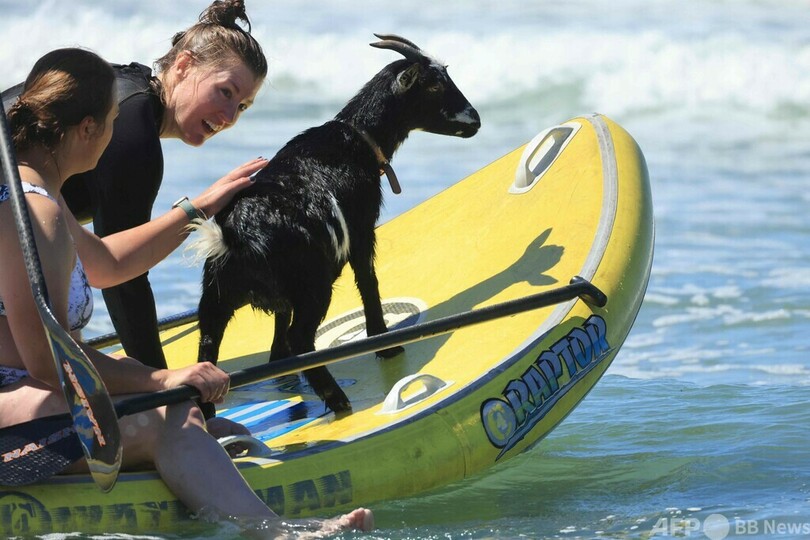 【9月16日 AFP】米カリフォルニア州のビーチで、2人のサーフィン初心者がポンプで膨らませるインフレータブルサーフボードに乗った。それを見守るインストラクターは、小さな黒ヤギのチュパカブラだ。