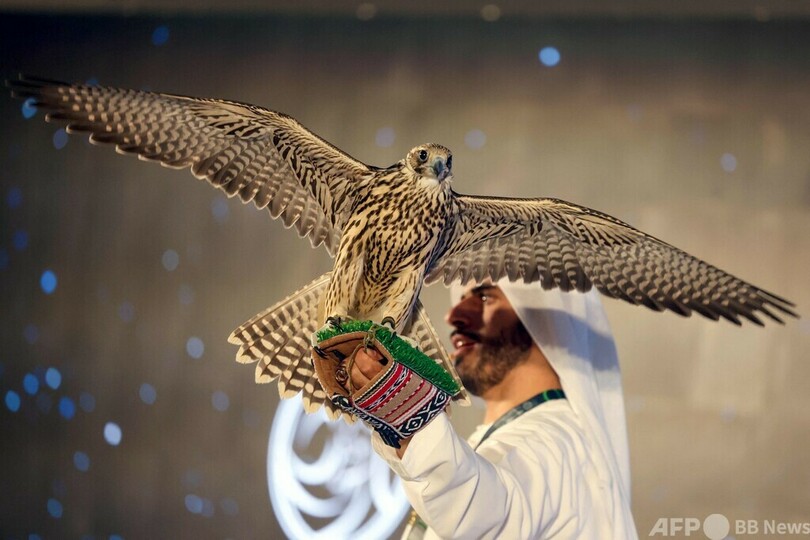 【9月14日 AFP】「アブダビ国際狩猟馬術展(Abu Dhabi International Hunting and Equestrian Exhibition、ADIHEX)」に展示される、目隠しされたハヤブサ。アラブ首長国連邦(UAE)のアブダビで。(c)AFP