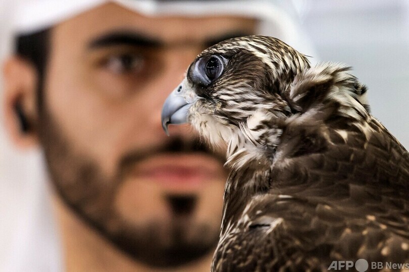 【9月14日 AFP】「アブダビ国際狩猟馬術展(Abu Dhabi International Hunting and Equestrian Exhibition、ADIHEX)」に展示される、目隠しされたハヤブサ。アラブ首長国連邦(UAE)のアブダビで。(c)AFP