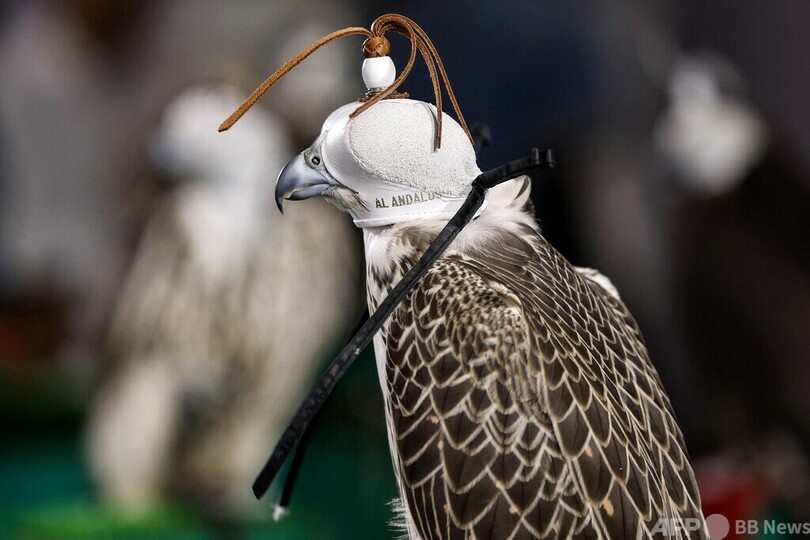 【9月14日 AFP】「アブダビ国際狩猟馬術展(Abu Dhabi International Hunting and Equestrian Exhibition、ADIHEX)」に展示される、目隠しされたハヤブサ。アラブ首長国連邦(UAE)のアブダビで。(c)AFP