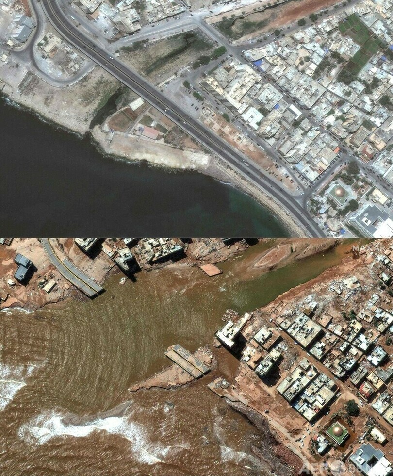 デルナでは10日夜、大雨による影響で上流にある2か所のダムが決壊し、洪水が発生した。洪水の様子を目撃した人は、津波に襲われたようだったと話している。(c)AFP
