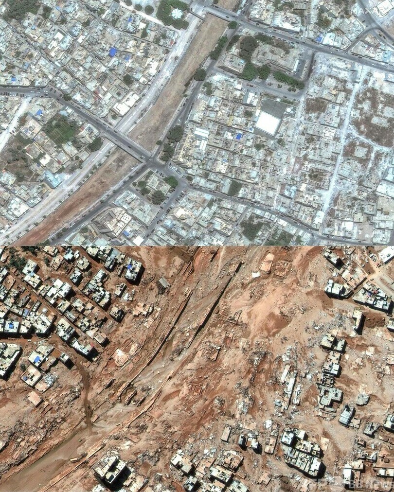 デルナでは10日夜、大雨による影響で上流にある2か所のダムが決壊し、洪水が発生した。洪水の様子を目撃した人は、津波に襲われたようだったと話している。(c)AFP