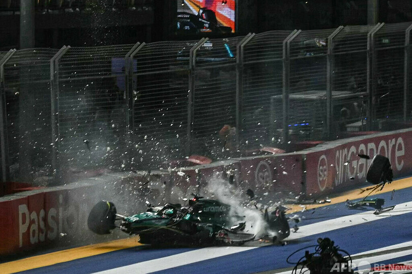 Q1では、アストンマーティンのランス・ストロール(Lance Stroll)が大クラッシュし、セッションが赤旗中断になるアクシデントがあった。マシンは壁に激しく衝突してスピンし、タイヤや車体の破片が飛び散るなどしたが、ストロールは無傷で歩いてその場を離れ、医師の診断でも問題はなかった。(c)AFP/Daniel HICKS