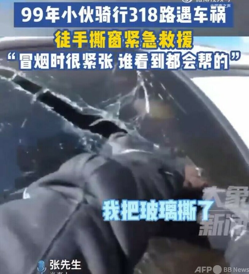 乗用車の屋根は大きく変形してドアは開けられなくなり、フロントガラスに大きなひびが入っていました。張さんが確認したところ、いずれのドアも開けられなくなっていました。張さんはバイク用手袋をつけている手で、フロントガラスの割れ目を引きちぎろうとしました。そして、もう一人の通りかかった人と力を合わせてフロントガラスの割れ目を大きく開いて、車内に閉じ込められていた2人のシートベルトをはずして、フロントガラスの割れ目から這い出させました。2人は体や頭に傷を負っていることが見て取れましたが、動くことはできました。張さんは、周囲に集まった人が、すでに携帯電話で救急車の出動を要請したことを確認した上で、現場を離れて走行を再開しました。張さんは後になり、救助の際に車から白い煙が出始めたのを見て、車が炎上するのはやはり怖かったと言いました。(c)CGTN Japanese/AFPBB News