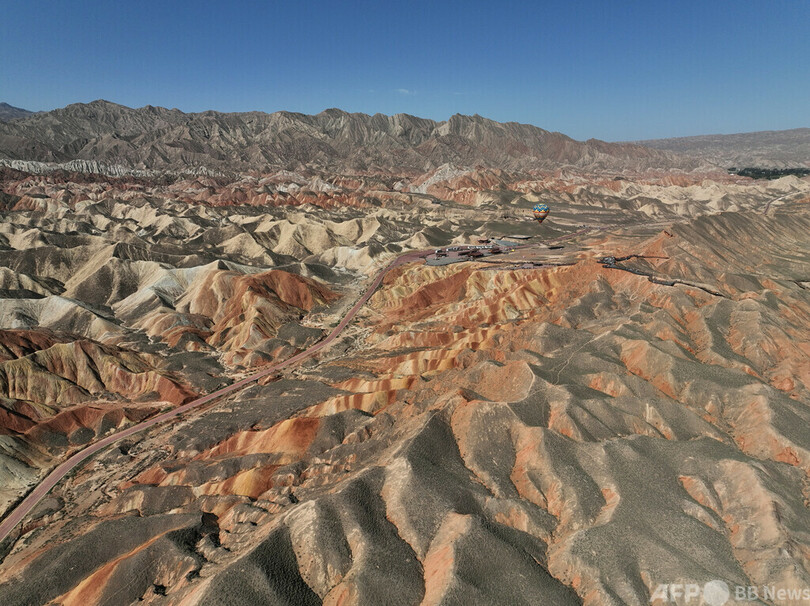 張掖七彩丹霞観光風景区は、堆積岩により100万年単位で地層が形成された独特の丘陵群。年代によって地層の色味が異なることから、カラフルで美しいしま模様の地層が見られる。2020年には、地球科学的に意義のある景観として、国連教育科学文化機関(UNESCO、ユネスコ)から「世界ジオパーク」に認定されている。(c)CNS/JCM/AFPBB News