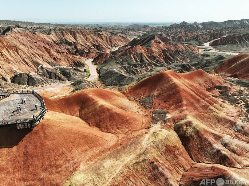 張掖七彩丹霞観光風景区は、堆積岩により100万年単位で地層が形成された独特の丘陵群。年代によって地層の色味が異なることから、カラフルで美しいしま模様の地層が見られる。2020年には、地球科学的に意義のある景観として、国連教育科学文化機関(UNESCO、ユネスコ)から「世界ジオパーク」に認定されている。(c)CNS/JCM/AFPBB News