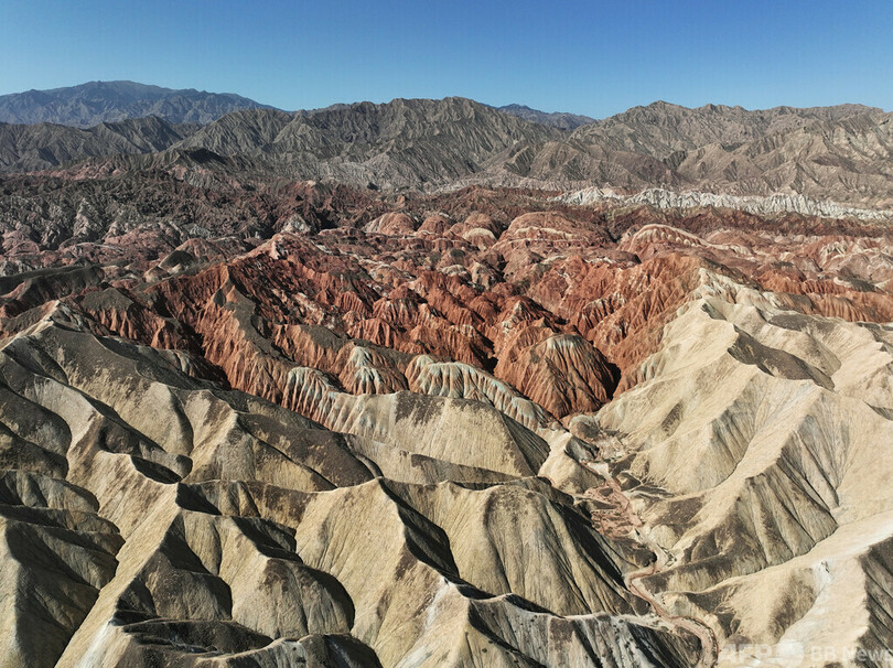 張掖七彩丹霞観光風景区は、堆積岩により100万年単位で地層が形成された独特の丘陵群。年代によって地層の色味が異なることから、カラフルで美しいしま模様の地層が見られる。2020年には、地球科学的に意義のある景観として、国連教育科学文化機関(UNESCO、ユネスコ)から「世界ジオパーク」に認定されている。(c)CNS/JCM/AFPBB News