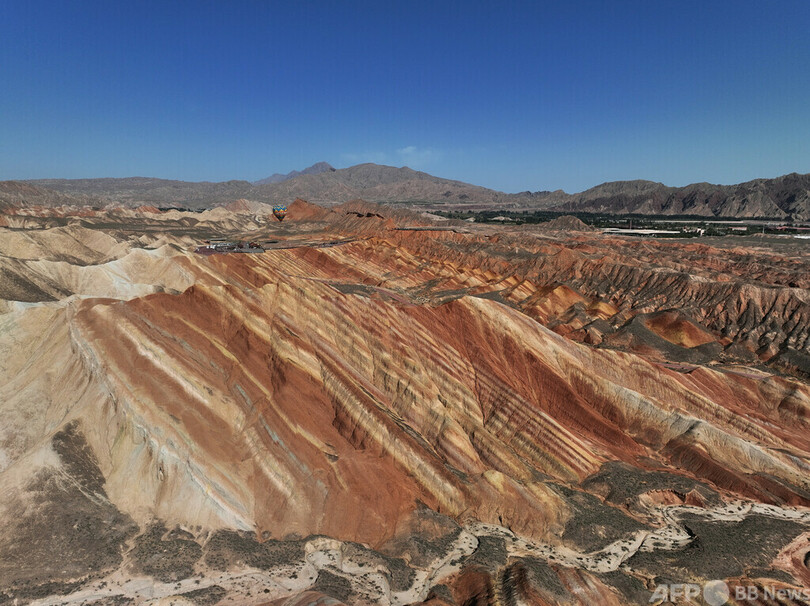 張掖七彩丹霞観光風景区は、堆積岩により100万年単位で地層が形成された独特の丘陵群。年代によって地層の色味が異なることから、カラフルで美しいしま模様の地層が見られる。2020年には、地球科学的に意義のある景観として、国連教育科学文化機関(UNESCO、ユネスコ)から「世界ジオパーク」に認定されている。(c)CNS/JCM/AFPBB News