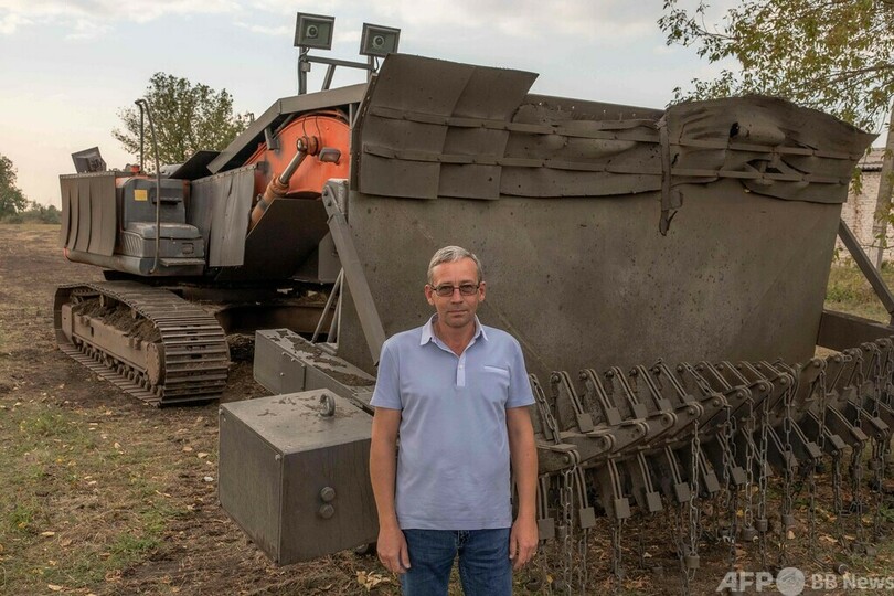 【9月22日 AFP】ウクライナ中部クリビーリフ(Kryvyi Rih)の軍事演習場で、エンジニアのビタリーさんは日立(Hitachi)のショベルカーを改造して造った地雷除去車の性能試験に臨んだ。