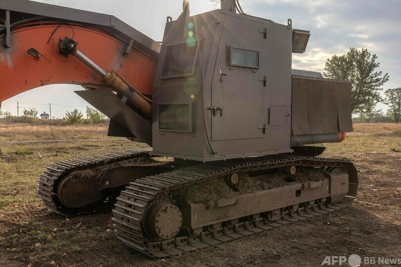 【9月22日 AFP】ウクライナ中部クリビーリフ(Kryvyi Rih)の軍事演習場で、エンジニアのビタリーさんは日立(Hitachi)のショベルカーを改造して造った地雷除去車の性能試験に臨んだ。