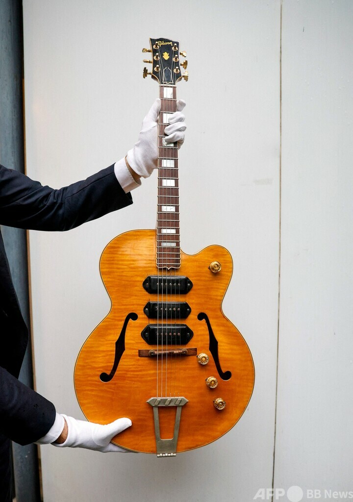 競売会社オテル・ドゥルオ(Hotel Drouot)による競売にはさまざまなアーティストのアイテム約200点が出品された。この帽子は目玉商品だったが、最高額で落札されたのは伝説的なブルース・ミュージシャン、T・ボーン・ウォーカー(T-Bone Walker)さん所有のギターで、12万9400ユーロ(約2000万円)だった。(c)AFP