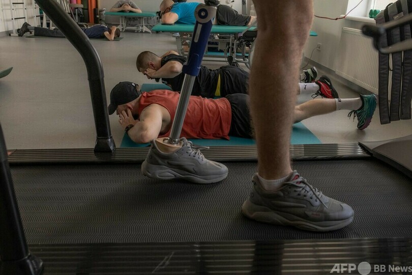 【10月3日 AFP】ウクライナ・リビウ(Lviv)のアンブロークン国立リハビリテーションセンター(Unbroken National Rehabilitation Center)で理学療法を受ける手足を失った兵士。