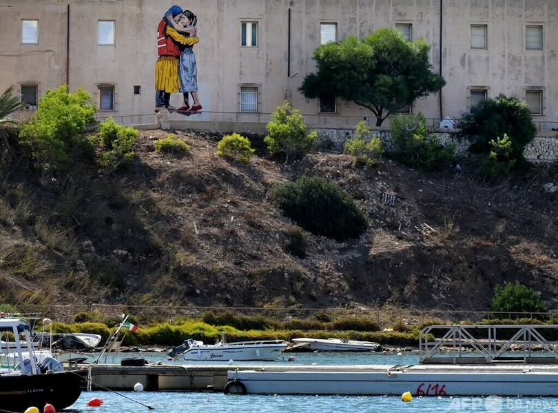 【10月6日 AFP】イタリア・シチリア(Sicily)島の南に位置するランペドゥーザ(Lampedusa)島の移民博物館の壁に描かれた抱き合う2人の女性。島民とライフジャケットを着た移民を表現した壁画はストリートアーティストのライカ(Laika)さんが国際人権団体「アムネスティ・インターナショナル・イタリア(Amnesty International Italia)」と協働で制作したもので、「共に立ち上がろう」というタイトルが付けられている。(c)AFP