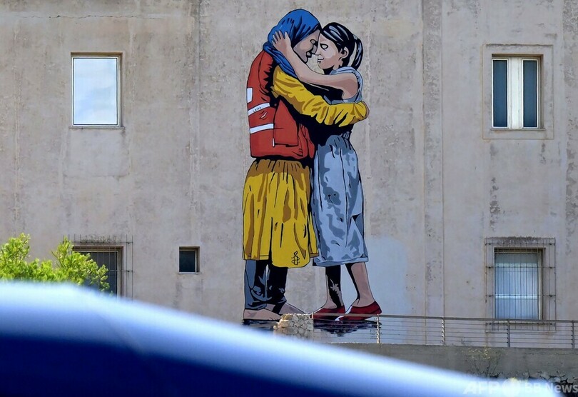 【10月6日 AFP】イタリア・シチリア(Sicily)島の南に位置するランペドゥーザ(Lampedusa)島の移民博物館の壁に描かれた抱き合う2人の女性。島民とライフジャケットを着た移民を表現した壁画はストリートアーティストのライカ(Laika)さんが国際人権団体「アムネスティ・インターナショナル・イタリア(Amnesty International Italia)」と協働で制作したもので、「共に立ち上がろう」というタイトルが付けられている。(c)AFP