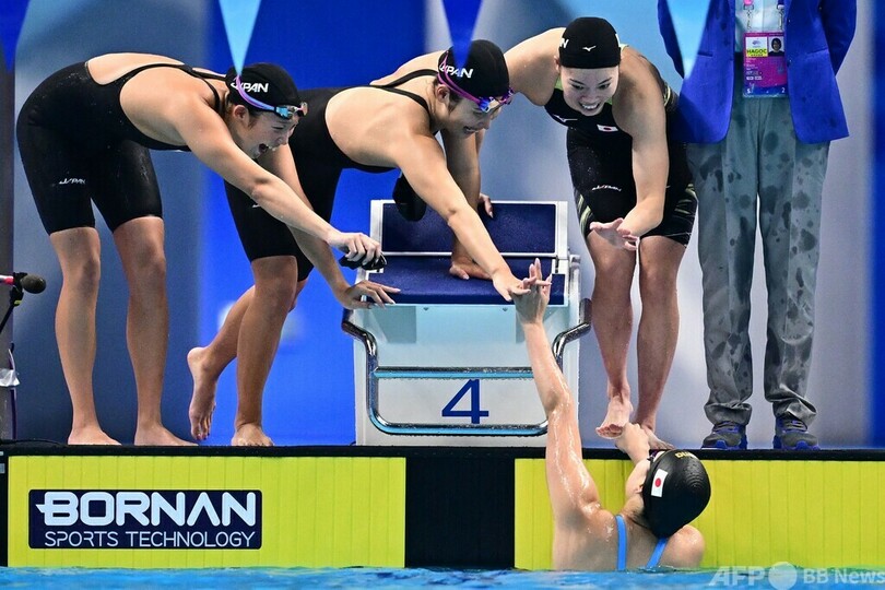 女子400メートルメドレーリレーは日本が3分57秒67で優勝。優勝候補に挙げられていた中国は予選で失格となった。(c)AFP