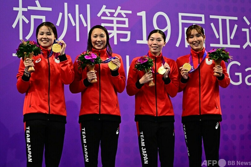 女子400メートルメドレーリレーは日本が3分57秒67で優勝。優勝候補に挙げられていた中国は予選で失格となった。(c)AFP