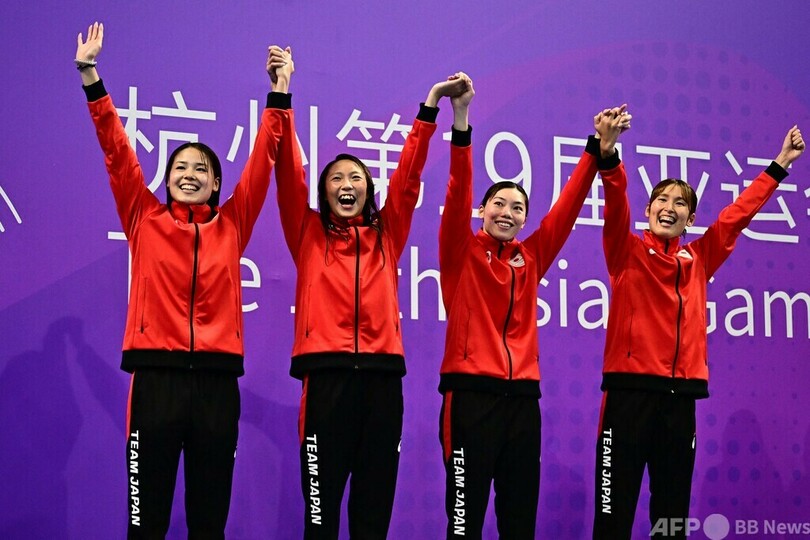 女子400メートルメドレーリレーは日本が3分57秒67で優勝。優勝候補に挙げられていた中国は予選で失格となった。(c)AFP