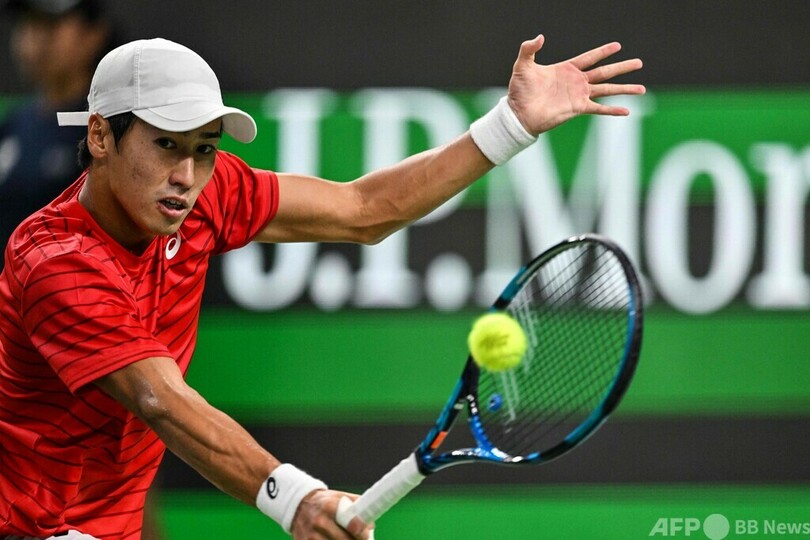 綿貫陽介(Yosuke Watanuki)は第7シードのテイラー・フリッツ(Taylor Fritz、米国)相手に奮闘したが、6-7(2-7)、7-6(8-6)、4-6で敗れた。(c)AFP/Rebecca BAILEY
