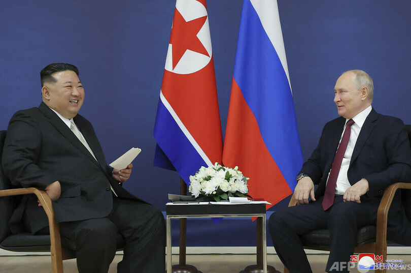 ロシアは、先月の金氏との首脳会談では北朝鮮からの武器供与について合意はなかったとしているが、プーチン氏は軍事協力の「可能性」はあると述べていた。(c)AFP
