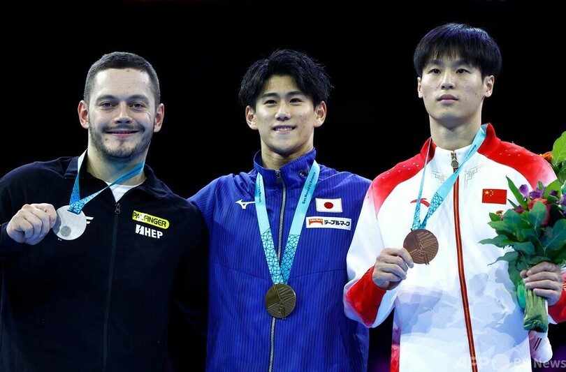 平行棒では杉本海誉斗(Kaito Sugimoto)が15.000点を記録し、銅メダルを獲得している。(c)AFP
