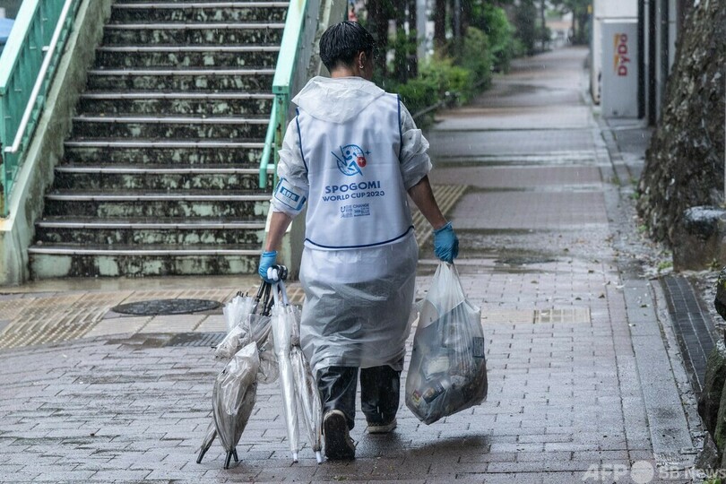 スポGOMIはスポーツとごみを掛け合わせた言葉で、できるだけ多くのごみを拾い集める日本発祥の競技。参加者は3人で1チームを組み、指定区域で1時間以内にごみを集め、制限時間内に分別し、重さを量る。海外の代表も参加する決勝は11月に日本で開催される予定だ。(c)AFP