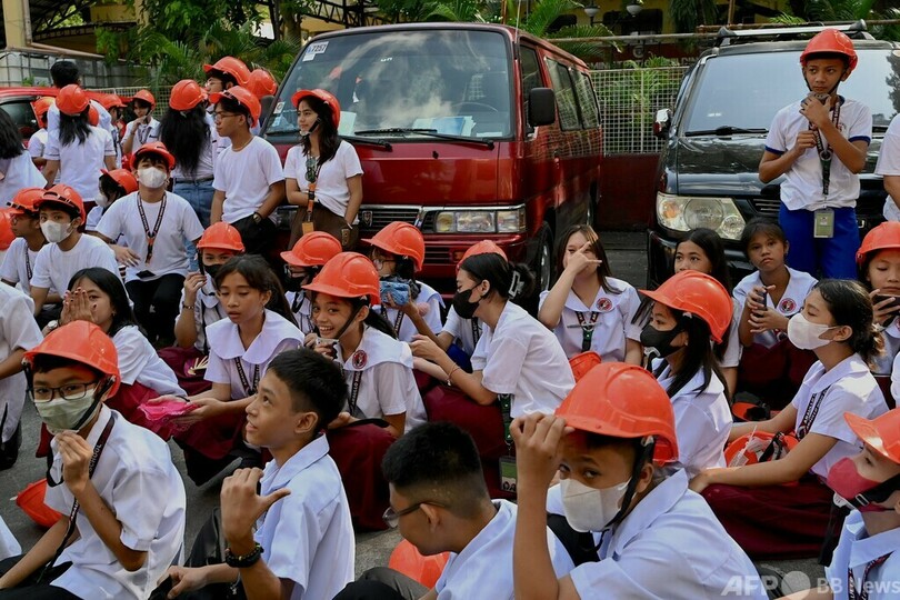 マニラでは生徒らが建物の外に一時避難した。(c)AFP