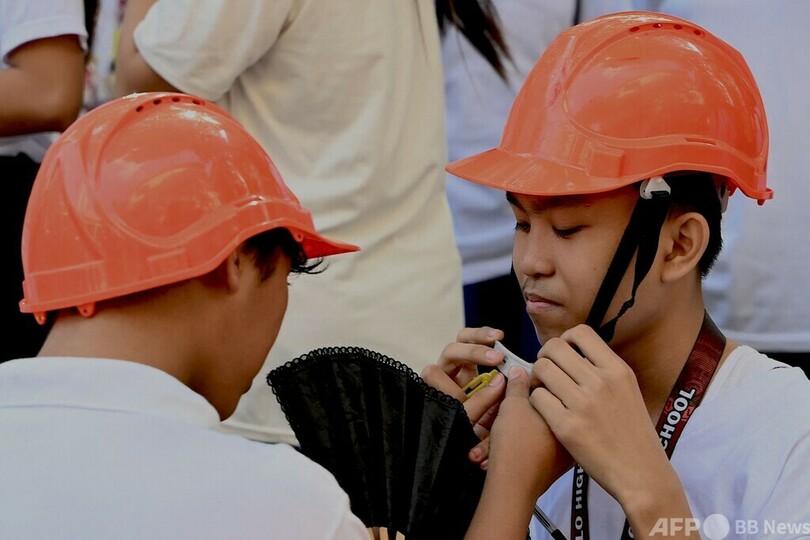 マニラでは生徒らが建物の外に一時避難した。(c)AFP