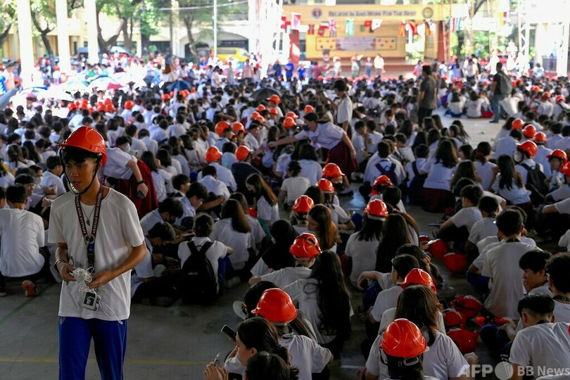 マニラでは生徒らが建物の外に一時避難した。(c)AFP