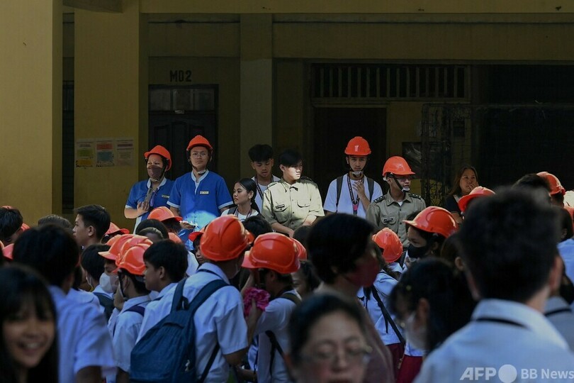 マニラでは生徒らが建物の外に一時避難した。(c)AFP