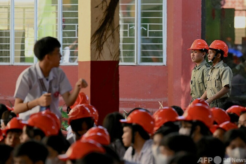 マニラでは生徒らが建物の外に一時避難した。(c)AFP